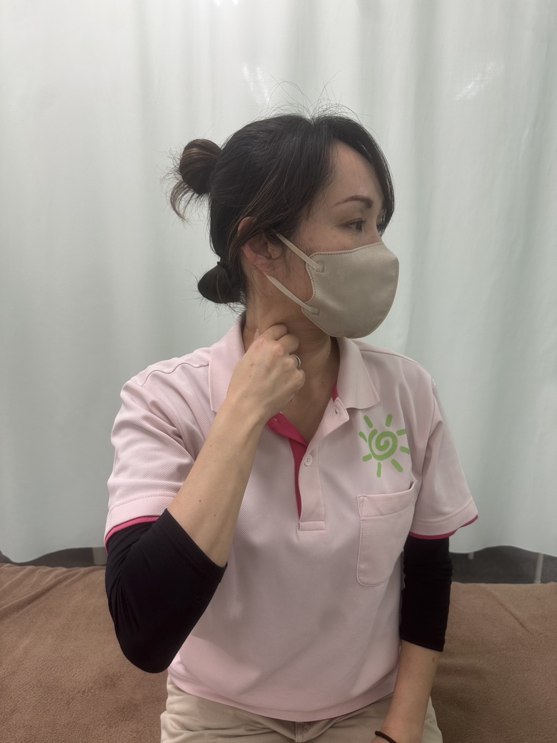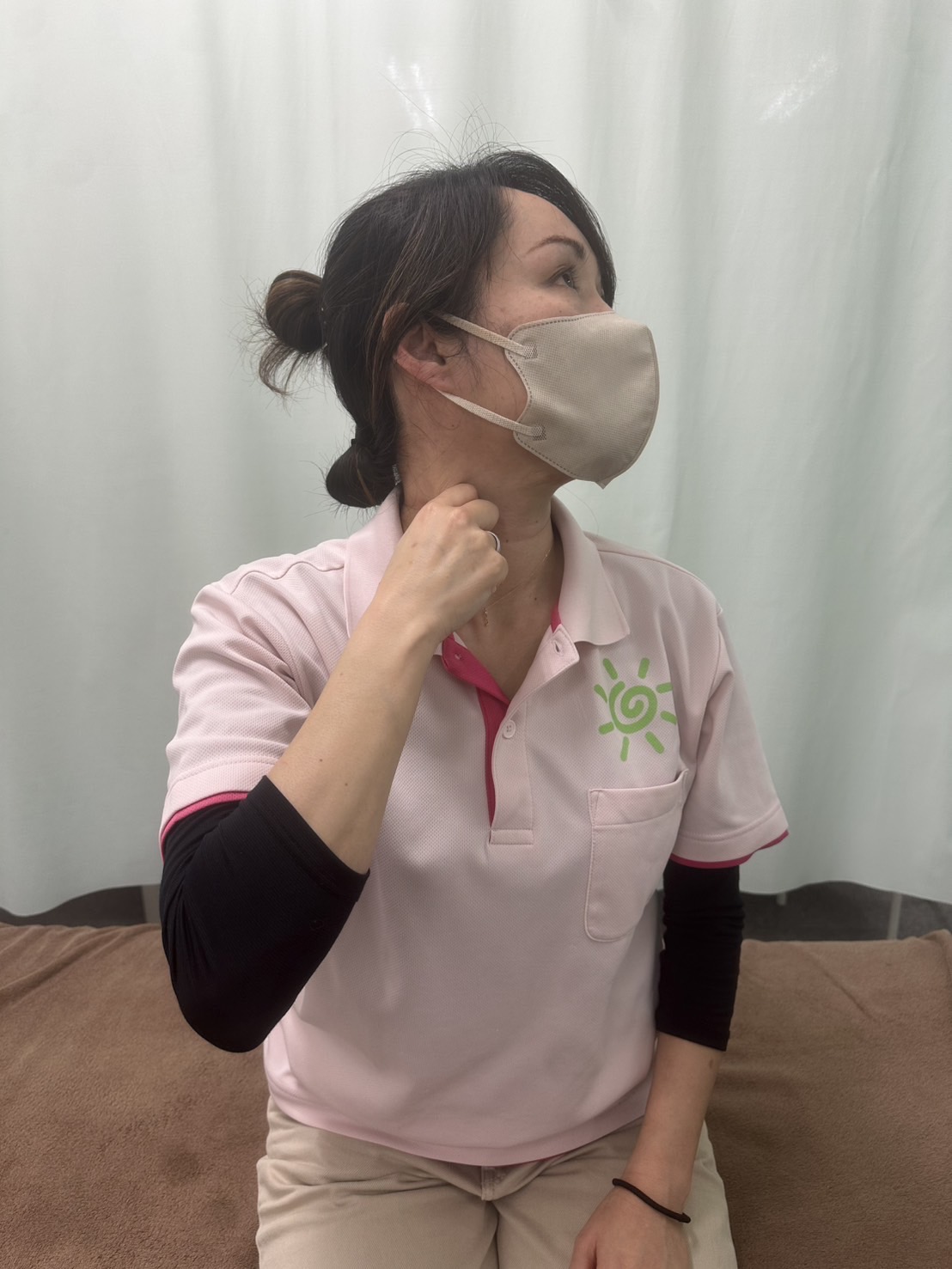 座った状態で横を向いてうきでてくる筋肉、胸鎖乳突筋を強くつまみます。