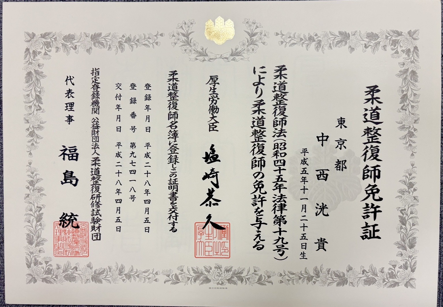 2016年 柔道整復師免許証取得大学卒業後、たいよう整骨院で正社員となる